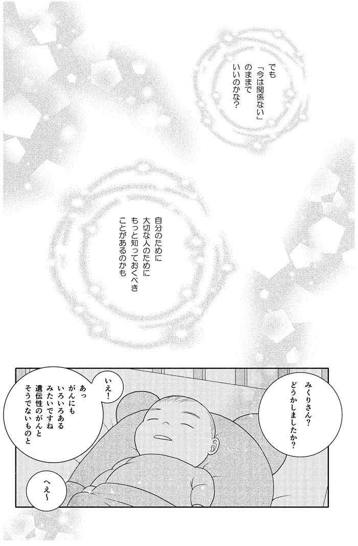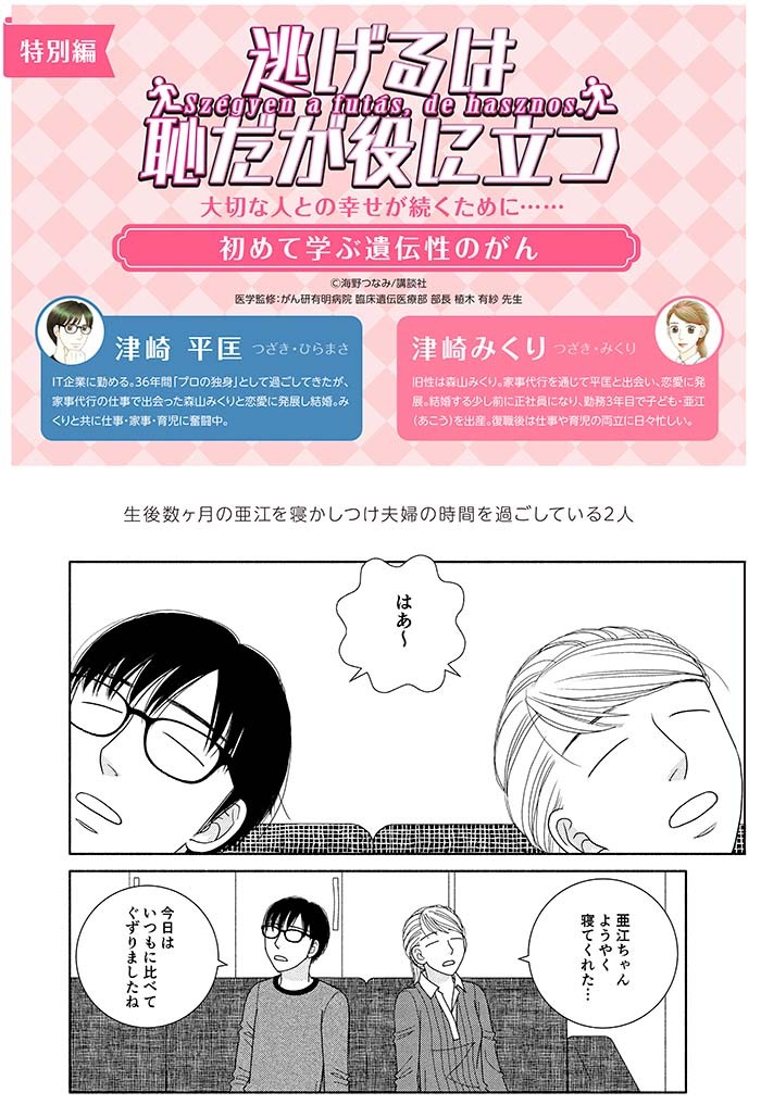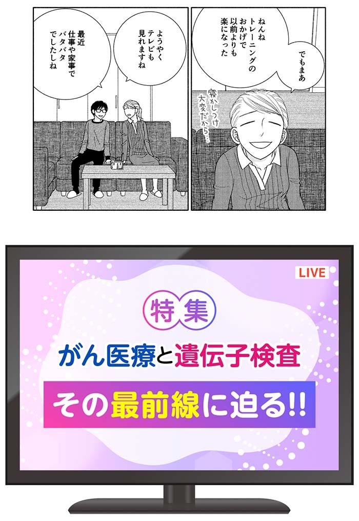 ・マンガ制作においては主人公(みくりさん)とパートナー(平匡さん)がテレビ鑑賞しているコマを使用し「日常感」を演出、多くのターゲットが物語へと自然に入っていけるよう工夫しております。また、遺伝性がんや遺伝子検査について説明する部分は、デザイナーさんに図版などを制作してもらい分かりやすく解説するよう配慮しています。