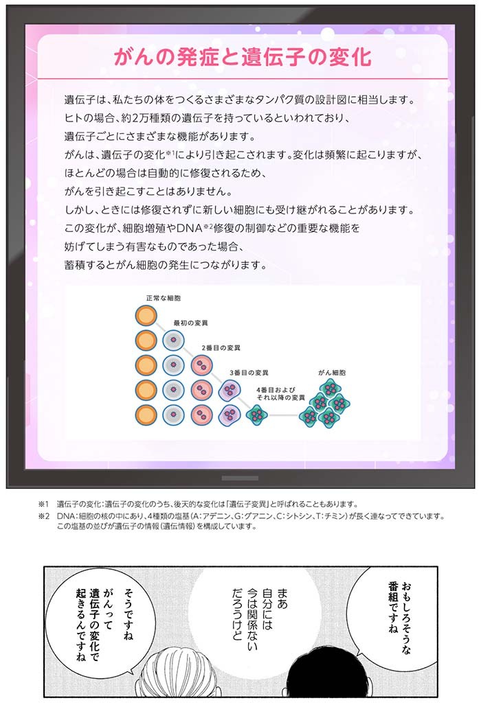 ・第1話では、がんの発症と遺伝子の変化について解説しています。