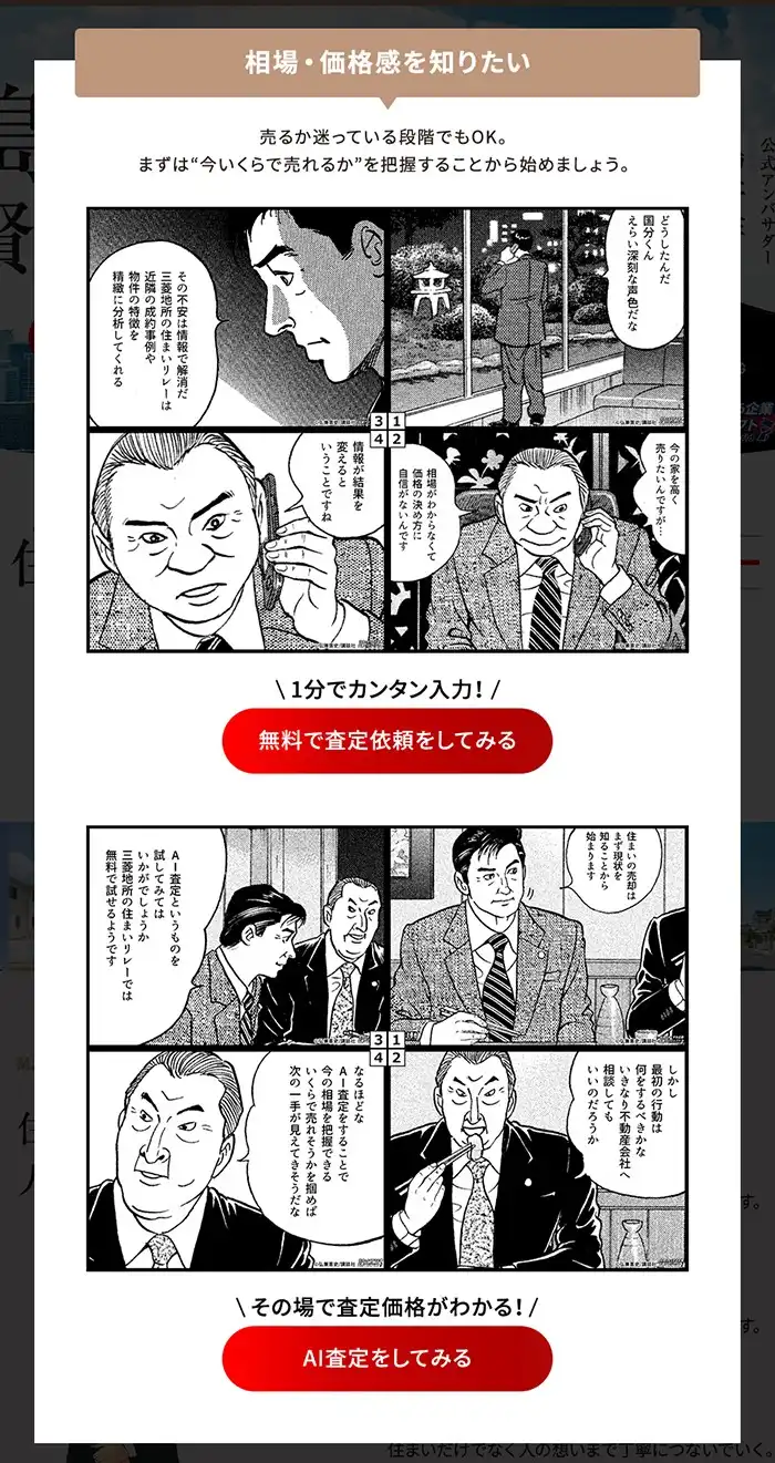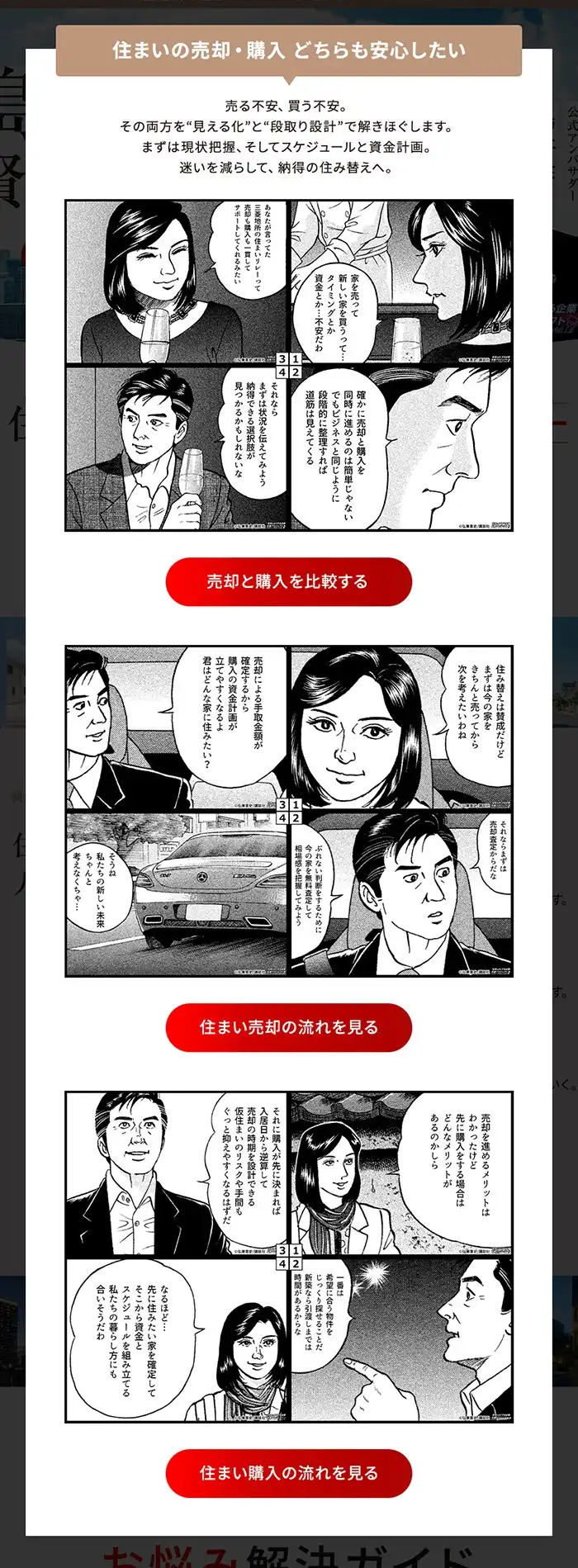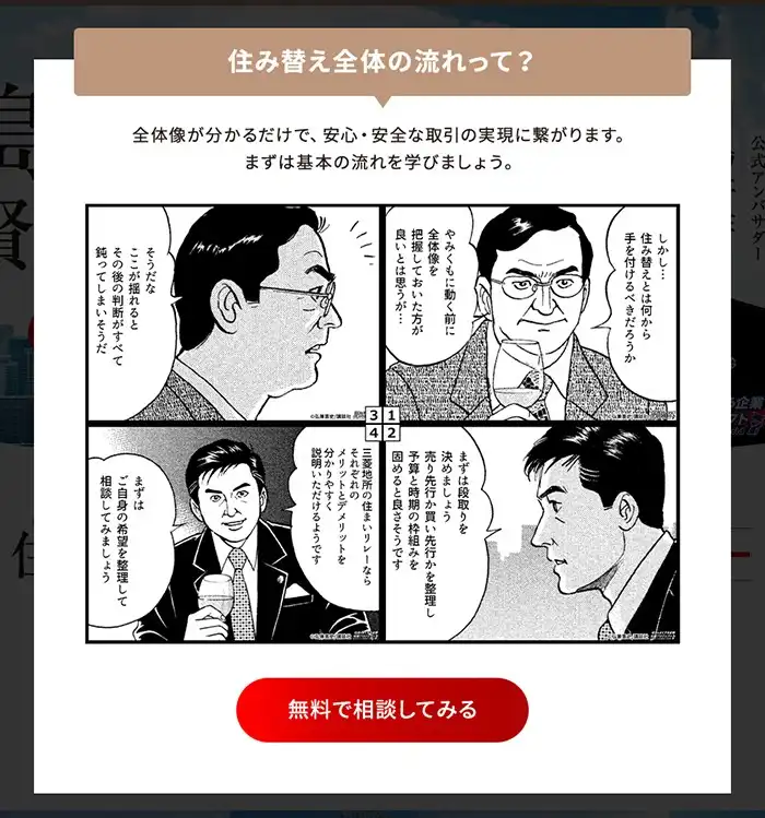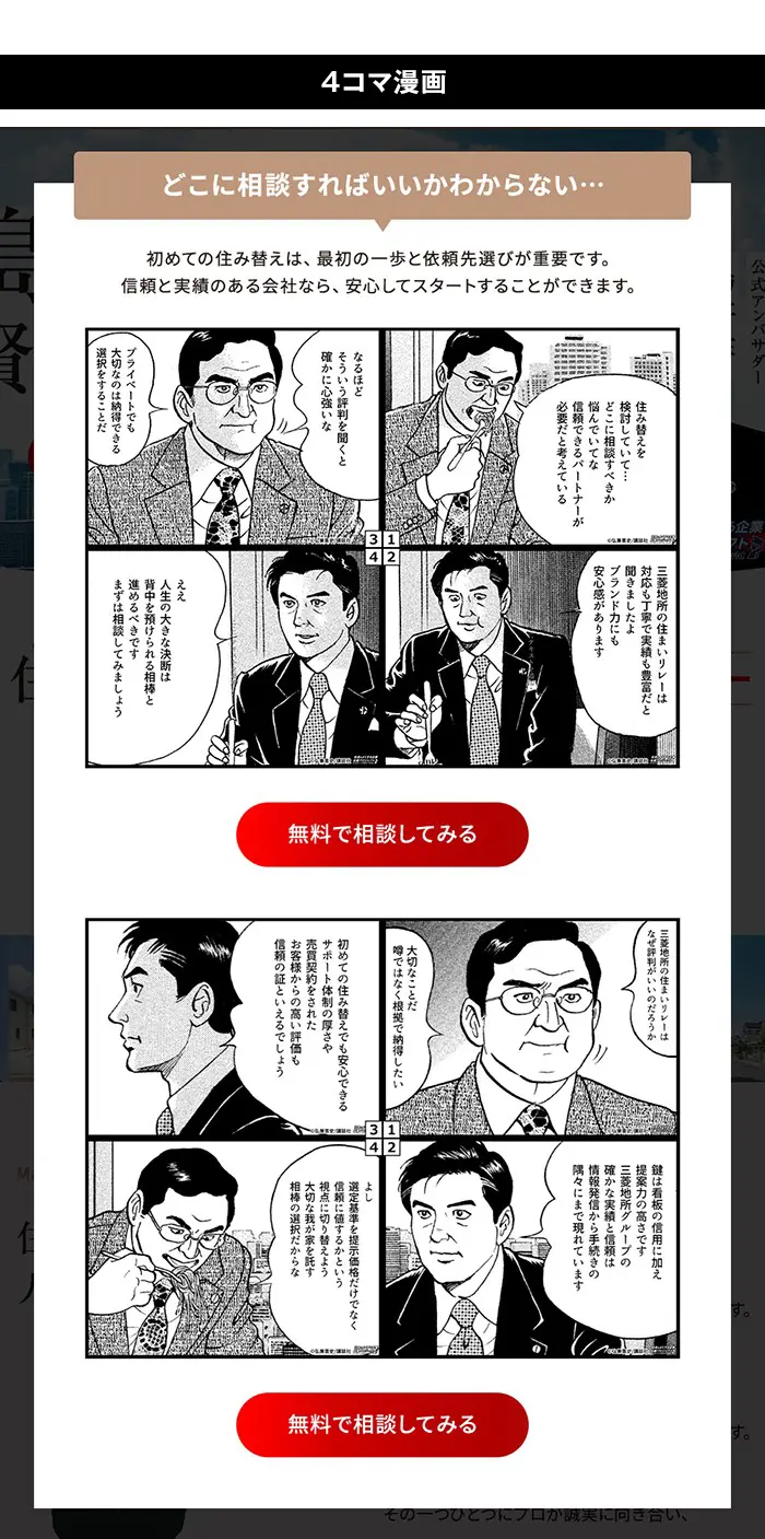「売りたい」「買いたい」といった住み替えのさまざまな疑問への導入として原作コマを使った4コマ漫画を活用し、LPで分かりやすく解説。