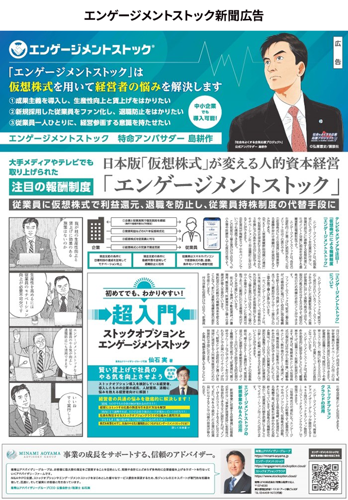 エンゲージメントストック(仮想の株式(ファントムストック)を従業員に付与し、仮想の株価により業績連動型報酬を従業員に現金で支給する制度)を推奨する南青山アドバイザリーグループ株式会社様の新聞広告を制作。