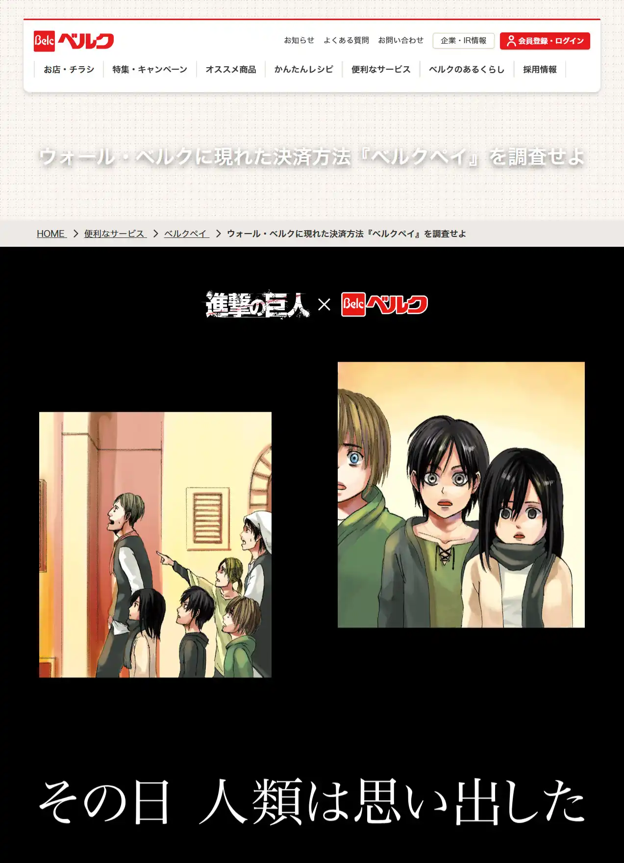 弊社が提供する『進撃の巨人』連載15周年記念原作版権タイアッププランのリリースを記念した「1社限定特別プラン」を射止めたベルク様が、自社の電子マネー決済方法「ベルクペイ」のキャンペーンに『進撃の巨人』を起用。
