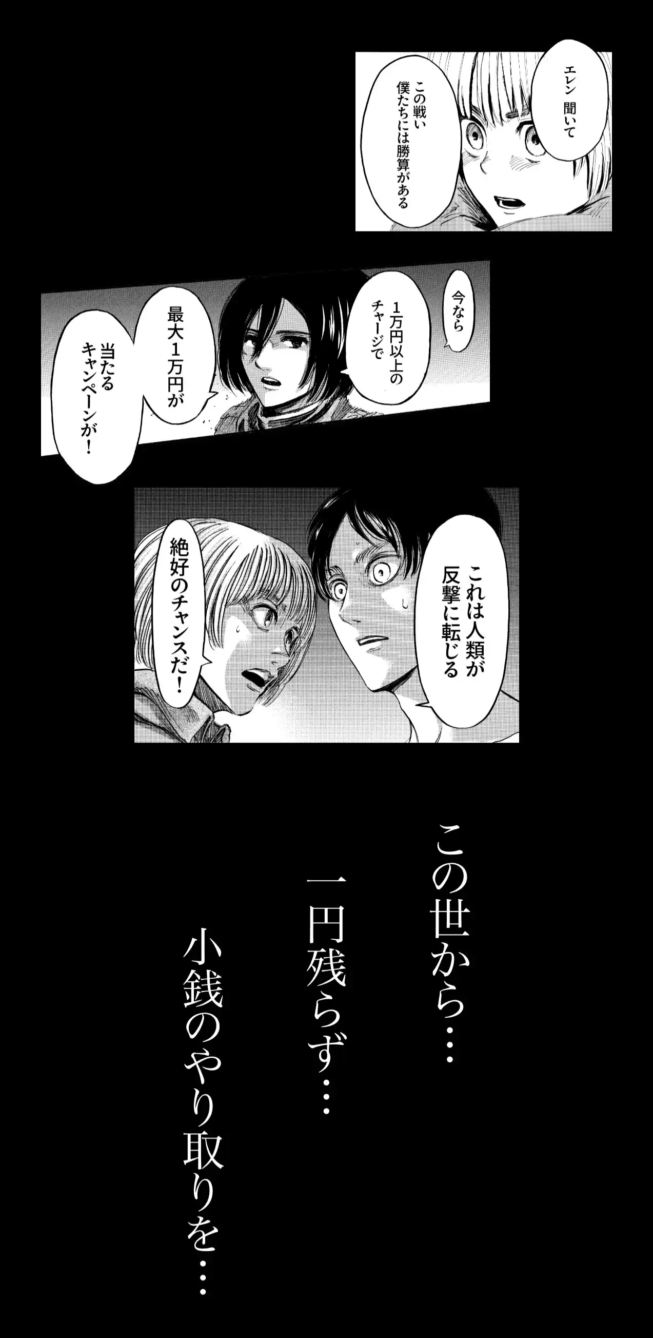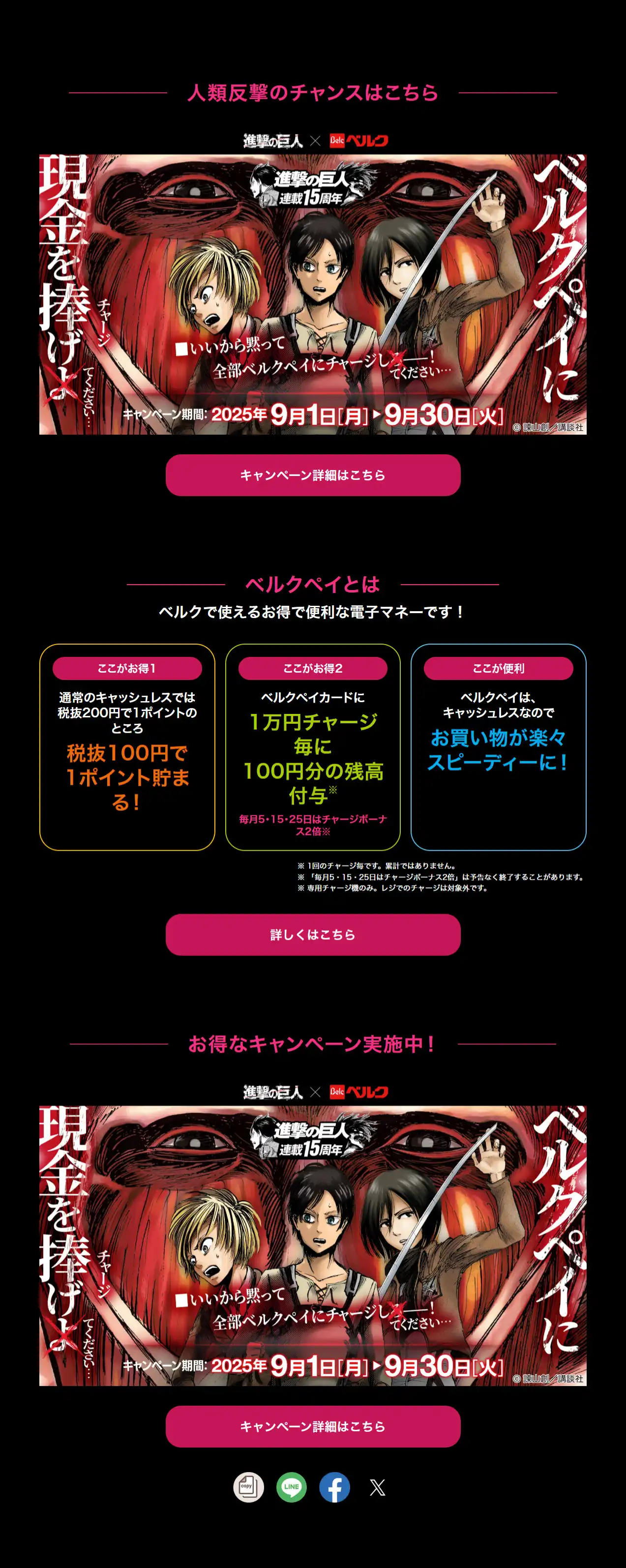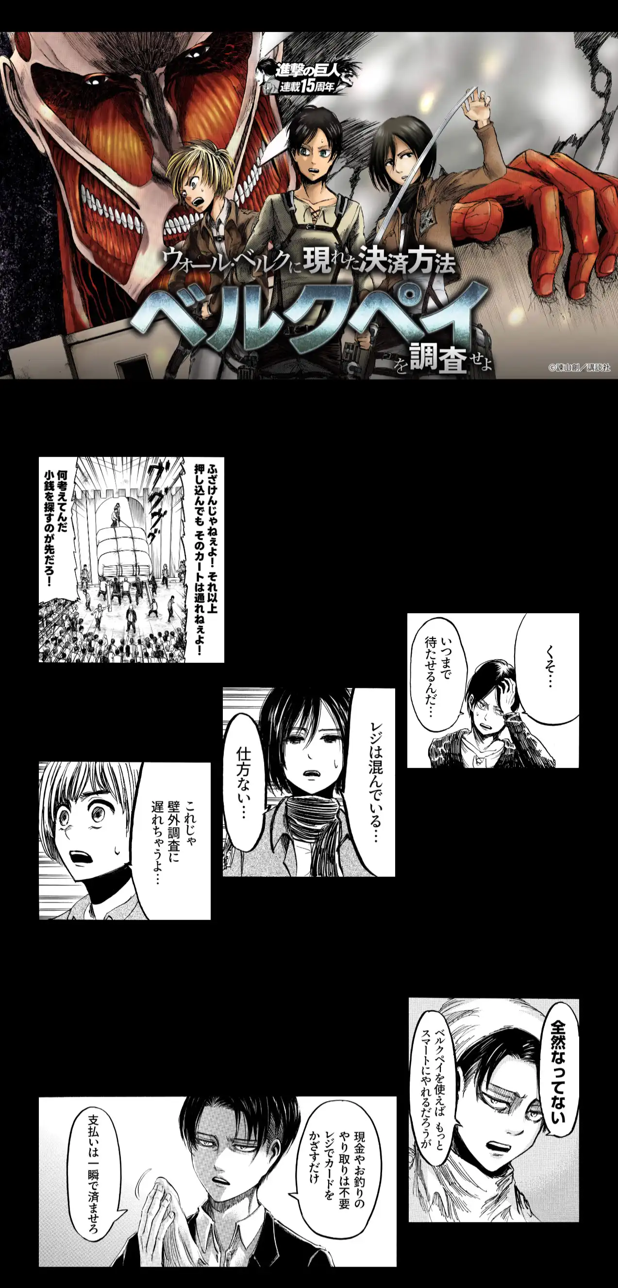 ©諫山創/講談社 画像引用:【第一弾】『進撃の巨人』×ベルクペイキャンペーン『ベルクペイに現金を捧げてください』 | ベルク : Belc-地域密着型スーパーマーケット