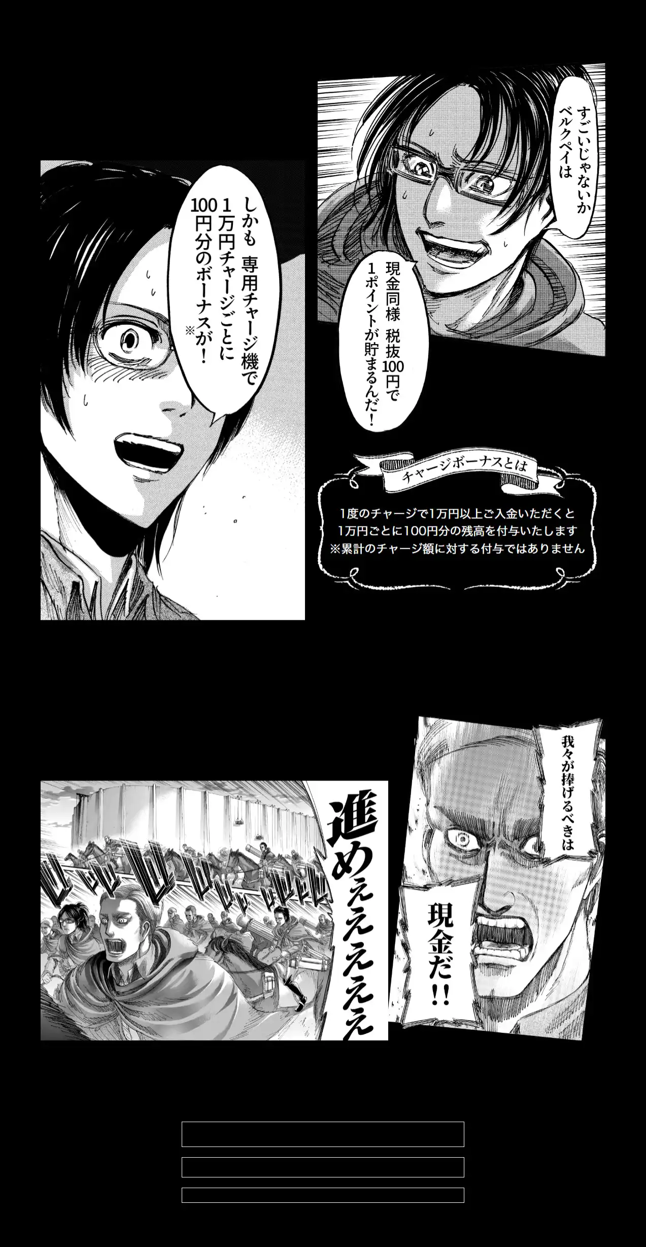 特設ページではこの『進撃の巨人』タイアッププランの特色の一つである、原作マンガのコマ組み換えサービスを使って、「ウォール・ベルク」「現金を捧げよ(てください…)」のように原作の世界観を活かしたサービスの説明を展開。