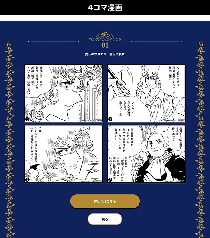 冠婚葬祭サービスを展開する株式会社セレモニー 様が「社会をよくする企業応援プロジェクト」の『ベルサイユのばら』を起用し、互助会のシステムや結婚式や葬儀についての注意点について原作コマを使った4コマ漫画で親しみやすく解説している。